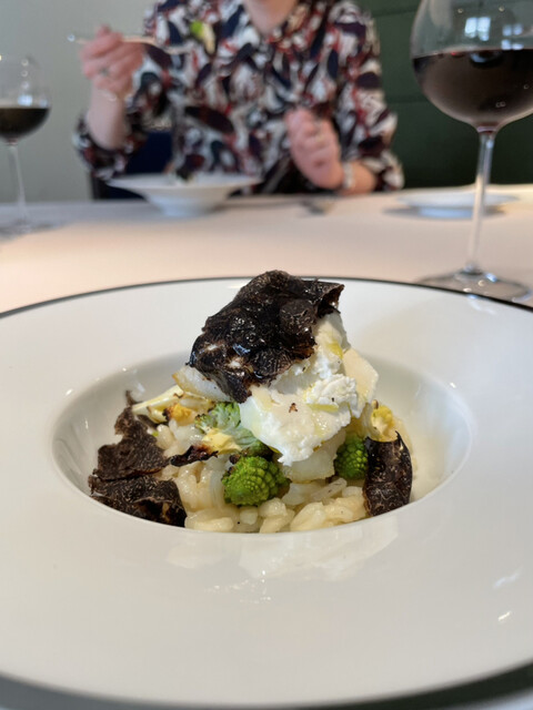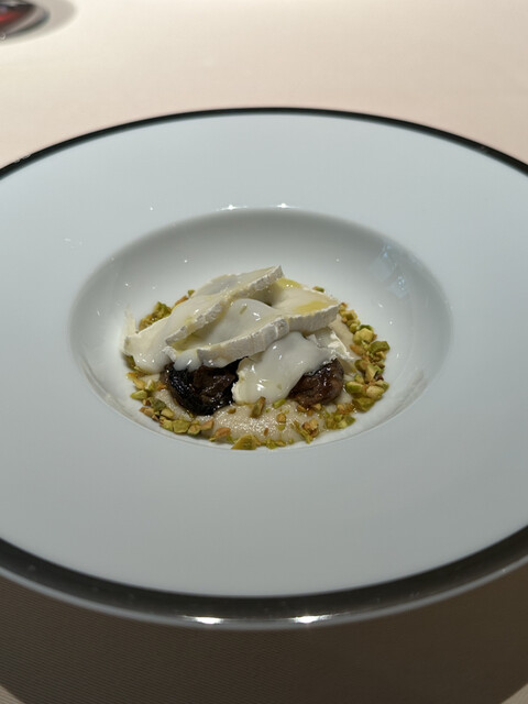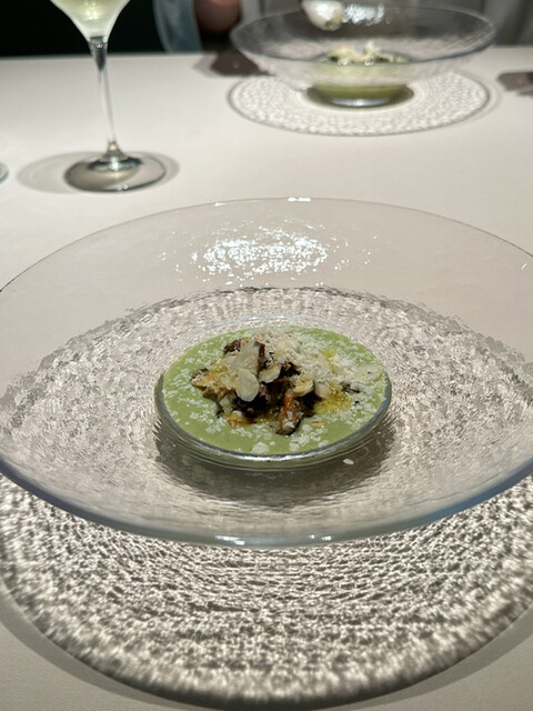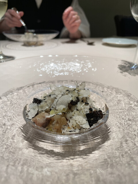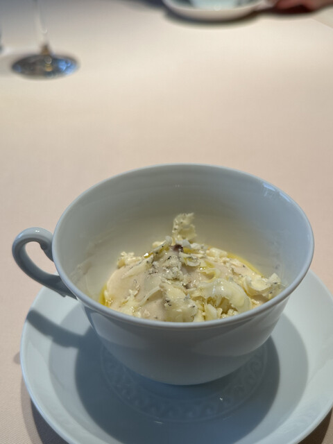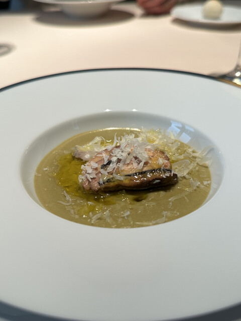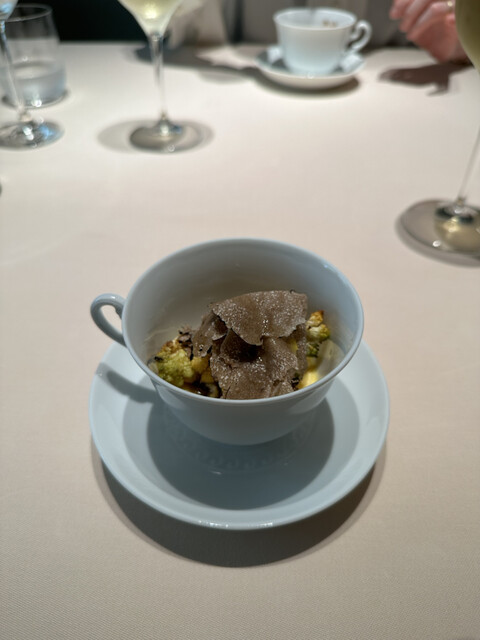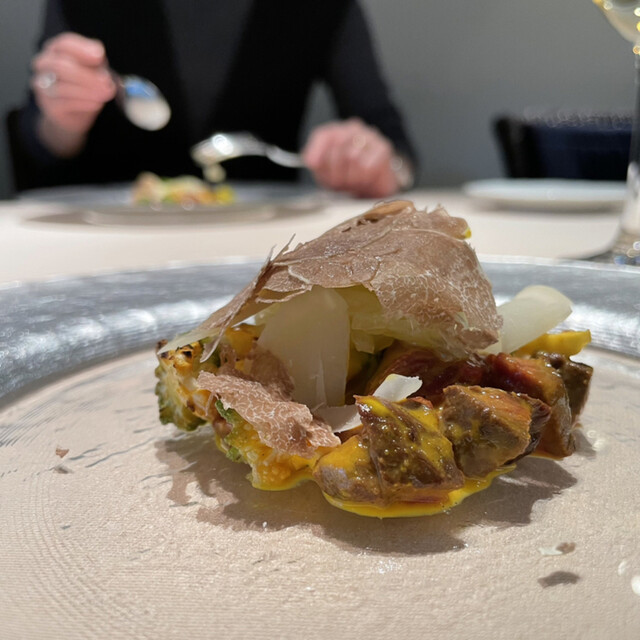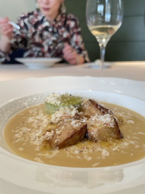 チーズと黒トリュフをおろして散らして、牛乳の泡、野菜・鴨フォアグラ・マスカルポーネのピュレをかけて。