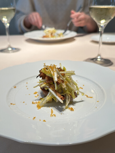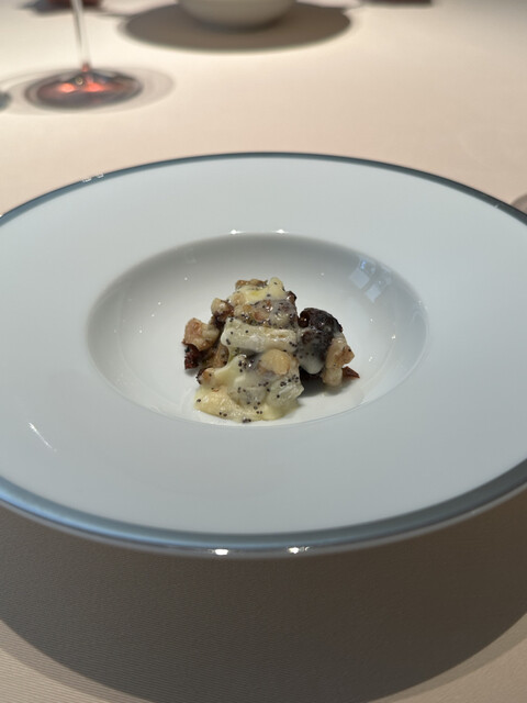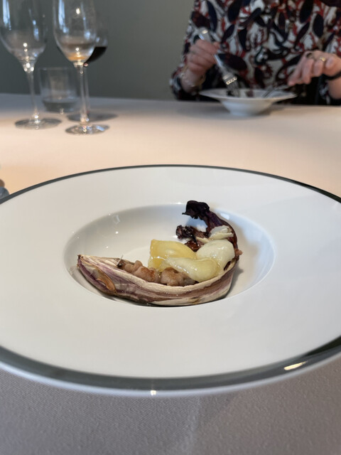 ラディッキオの苦味と胡桃、ソースまでが相性よく重なり、深い位置から登ってくるような力強い美味しさに。