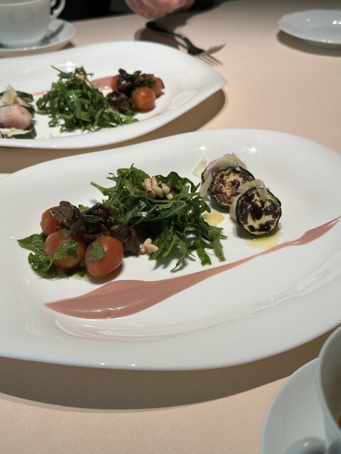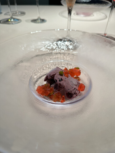 トマトをくり抜いて、中にトマトとビエトラと鳩の砂肝・心臓・レバー、マスカルポーネのババレーゼ