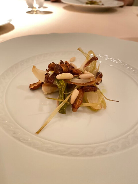 イワナのムニエル風ジロール、バルサミコ酢、トスカーナのオリーブオイル、松の実