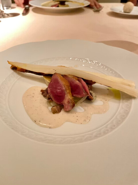 鳩の胸肉/もも肉/心臓/レバー/白玉葱、内臓や砂肝/心臓/胸肉/アーティチョーク/パルメザンチーズなどのムース、マスカルポーネチーズと胡椒などのソース、白アスパラガス