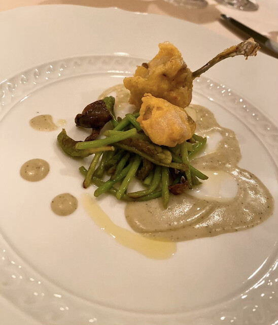 蛙のふくらはぎのベニエ、スプマンテ、クミンシード、アスパラソバージュ、ゴルゴンザーラチーズ