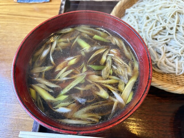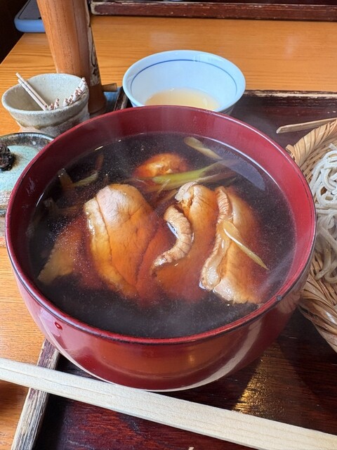鴨ざるを注文。温かいつゆの中に鴨肉が4枚くらいとネギが入ってる。よーくダシが効いてて、鴨の肉の脂もでてる。お蕎麦を入れて食べるととても美味しい。蕎麦の味がどのように良いかはむずかしいけれど、良い味わい。
