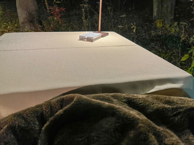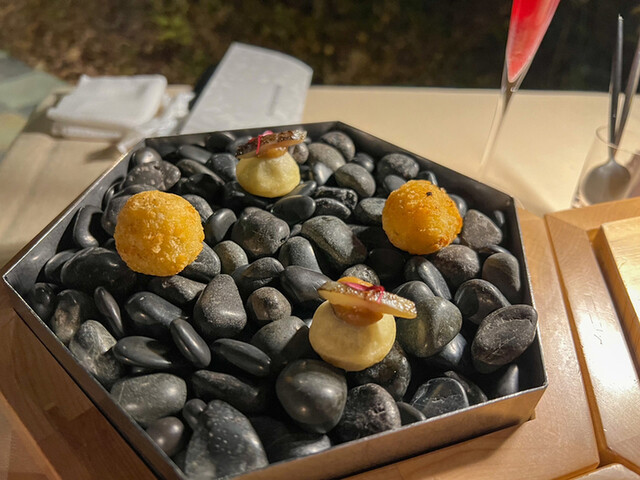 まず驚いたことに、前菜はレストランの外の空間で焚火と炬燵のある空間でいただきました。