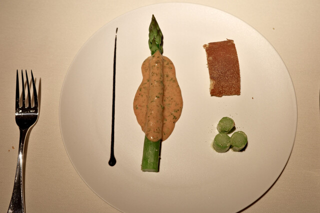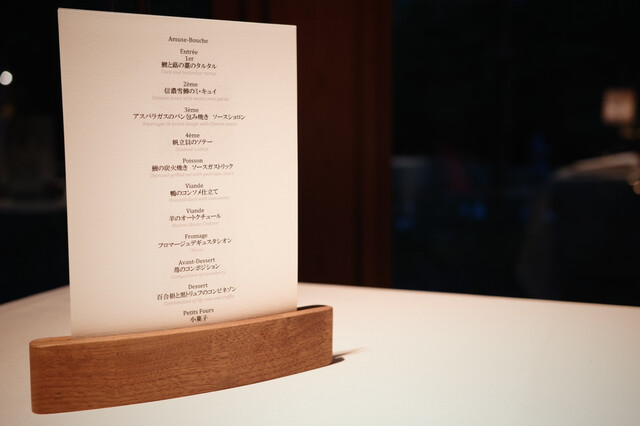 お店に着くと、スタッフが出迎えてくれて、夜は肌寒い4月ですが、アペリティフとアミューズブーシュをテラス席でのオファーをして頂きました。こたつやストーブもあり、暖かそうにも見えたのですが、お昼もカフェもテラス席で頂いてた為、店内を選択しました。
