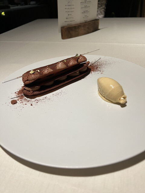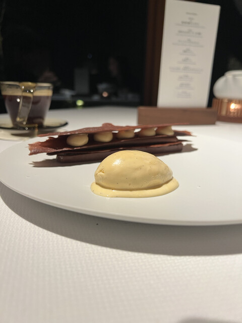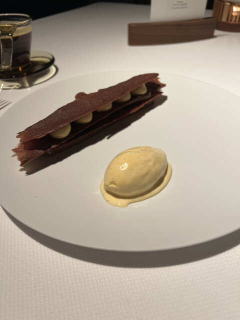 グランデセール(チョコレートのミルフィーユ)は薄く焼かれたチュイルのようなパリパリの生地に、きめ細やかなクリームが並びます。横には香り高いバニラのアイスクリーム。
