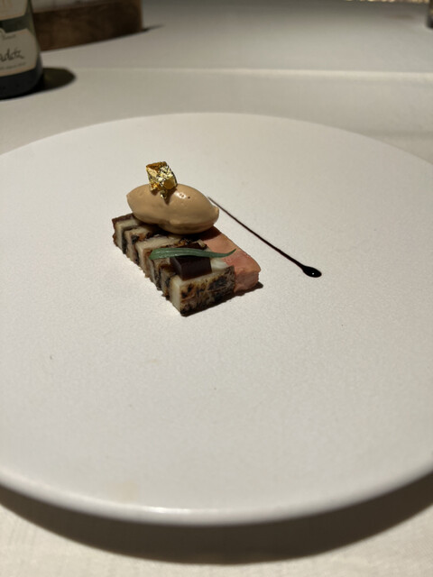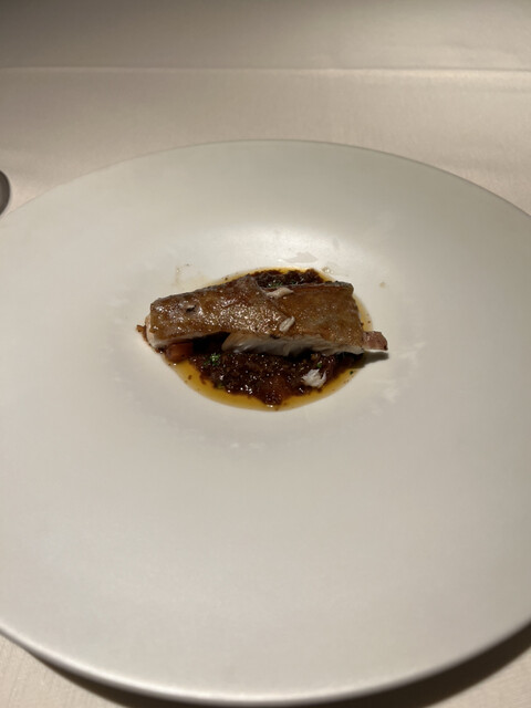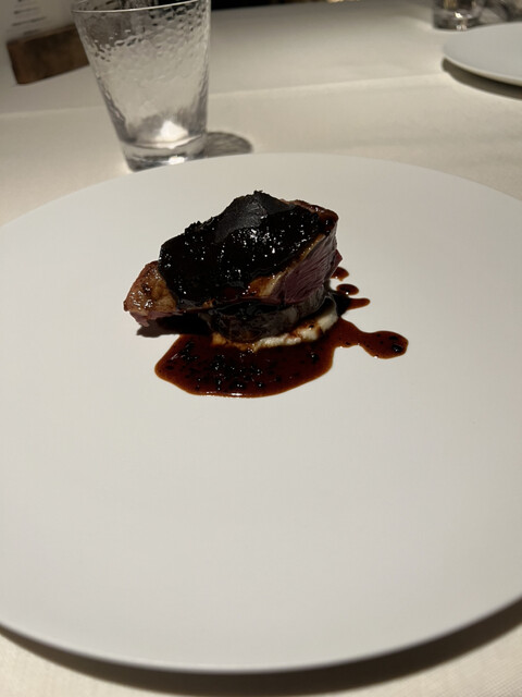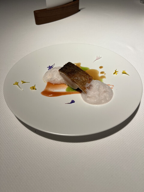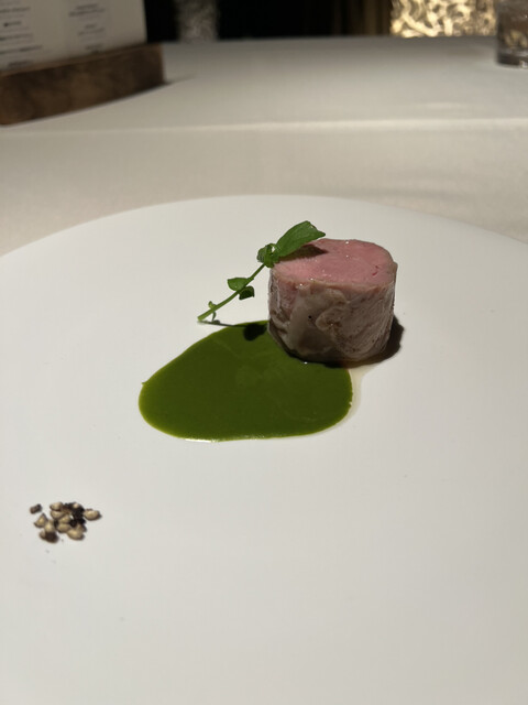 魚料理はサーモンのピュレ仕立て。皮目をパリッと焼き、泡状のソースと野菜のエッセンスと合わせます。赤・緑・白のコントラストが美しく、火入れはミディアムレア寄りで、ふっくらとジューシー。盛り付けも繊細で、まるでキャンバスに描いた抽象画のようでした。