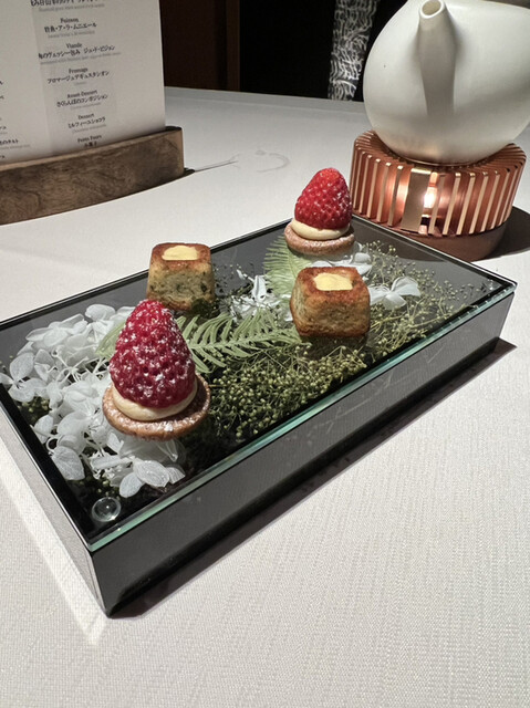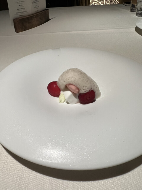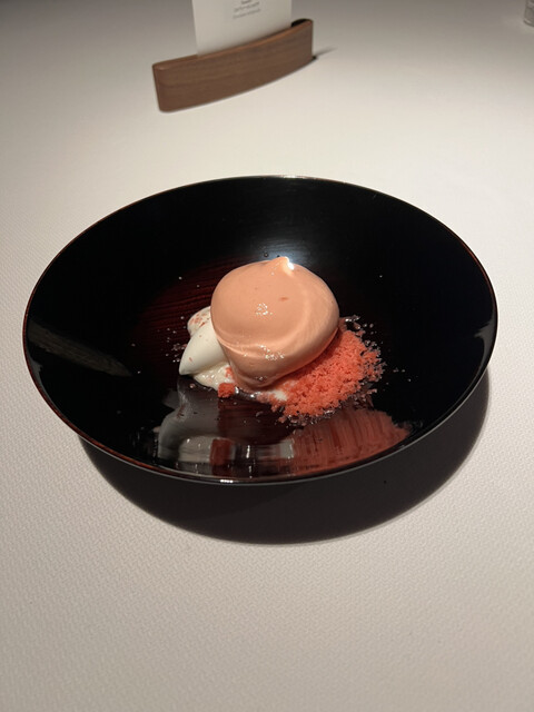 赤いドームに包まれたデザートは、見た目はモダンながらどこか和の趣も。中は苺のムースにクリームやソルベなどが重ねられており、層ごとに異なる食感と酸味・甘味のバランスが楽しめました。器も漆黒の深い色合いで、和洋の融合を感じさせます。