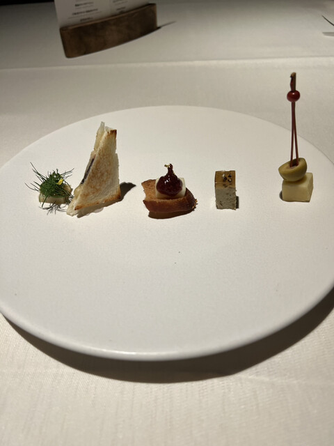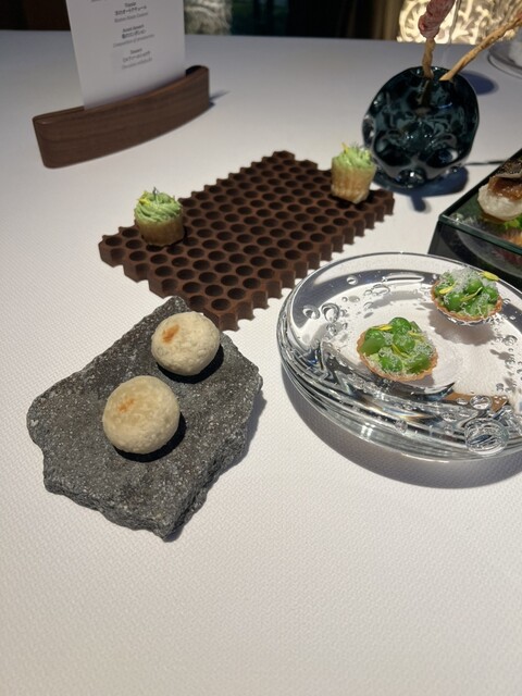アミューズ・ブーシュは、見た目のインパクトと遊び心あふれる盛り付け。石や木片の器に載せられた小さな一品たちが、まるで森の中の宝石のよう。