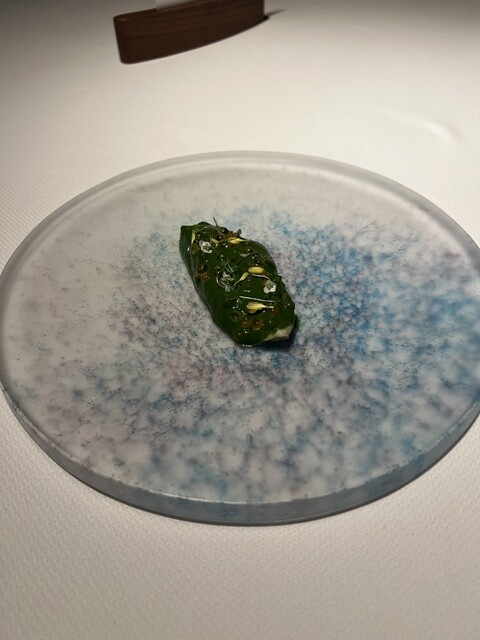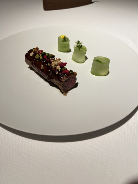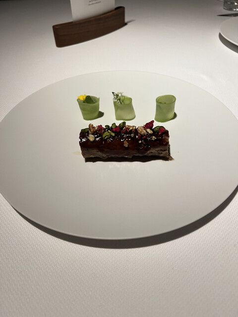肉料理は「仔羊のオートクチュール」という名にふさわしく、羊肉は細長く成形され、上にはピスタチオやドライベリー、グラノーラのような粒々が彩りと食感を添えていました。横に並ぶ胡瓜の円筒には、異なるハーブがそれぞれ忍ばせてあり、ひとつひとつが香りのアクセントに。