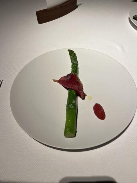 アスパラガスと生ハムの一皿は、シンプルながら火入れと塩使いが絶妙。