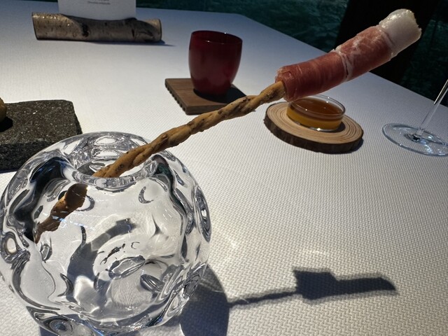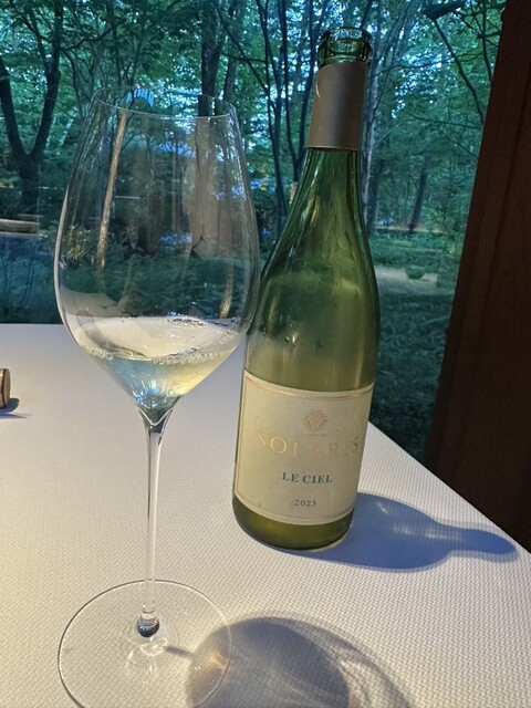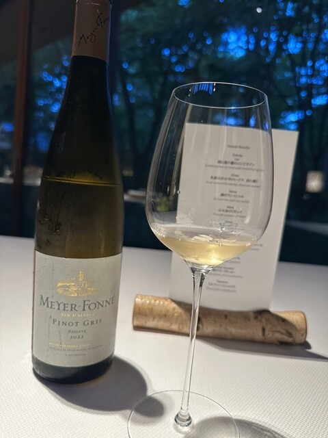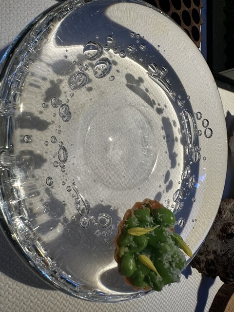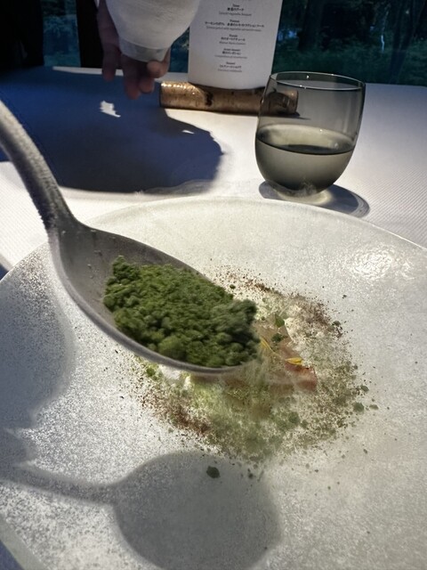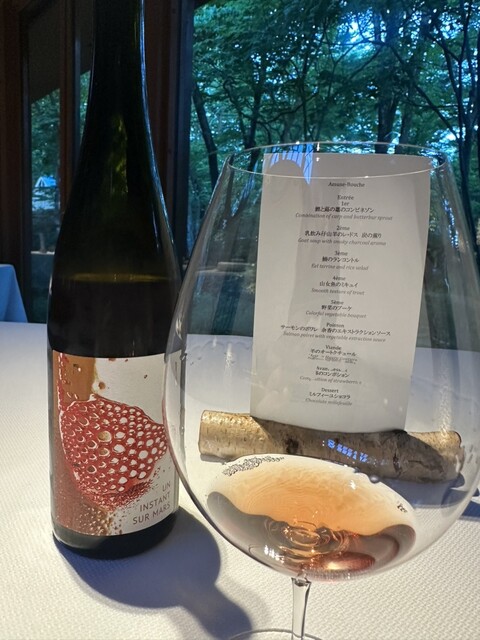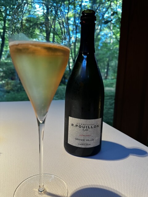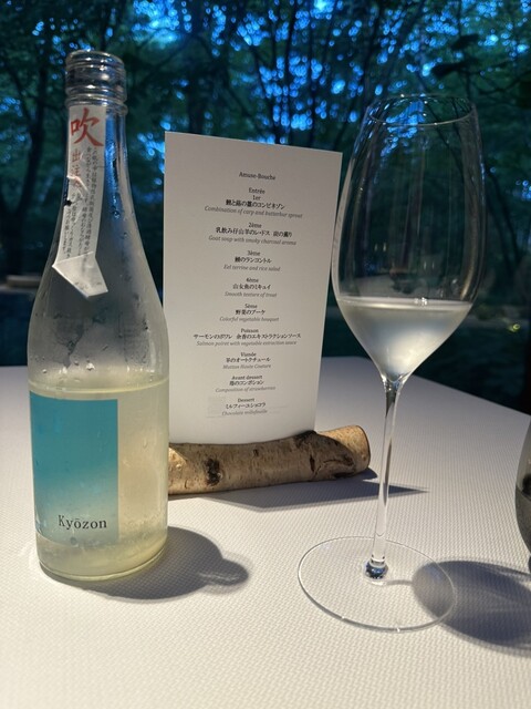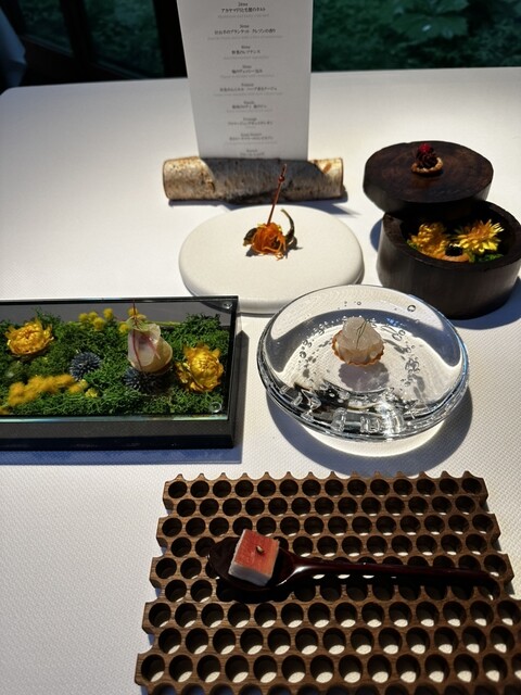 お店は新緑が美しい森の中にありそれだけでとても癒されます。シャンパーニュを注文しますと、まずアミューズが8種類一気にテーブルに並べられます。
