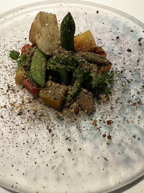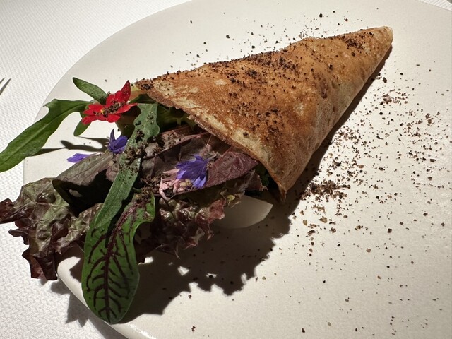 ライ麦のクレープ 中には野菜ごとに調理法を変えた季節の野菜 ブラックオリーブのパウダー ドレッシングは無く野菜だけの味です