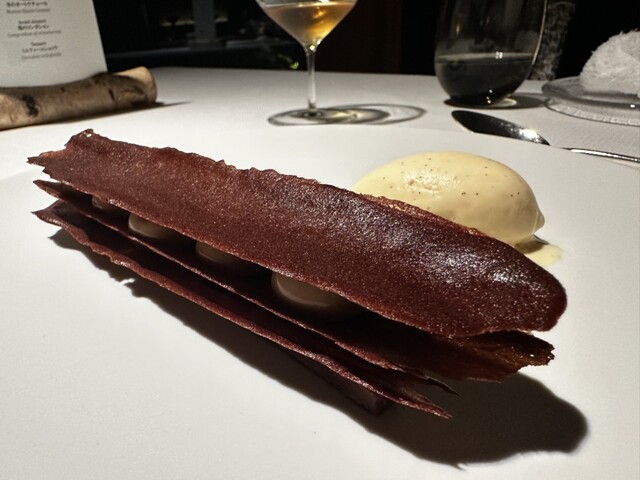 カカオの生地のミルフィーユのようなチップス 白あんのショコラ ショコラムース ショコラクリーム バニラとクロモジのアイス