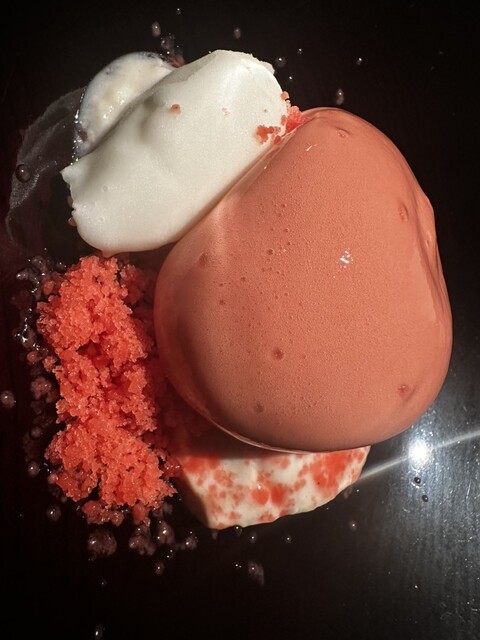 いちご いちごのコンポート いちごのソルベ ゴマのブラマンジェ ホエイヨーグルトの上積み部分のシャーベット