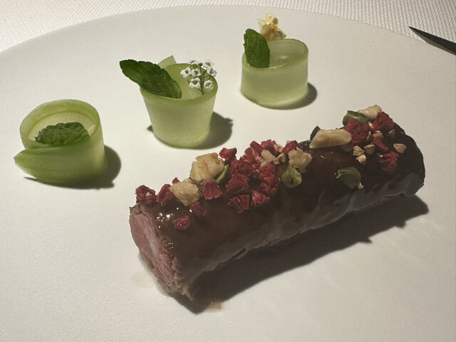 羊の色んな部位を組み合わせたもの ナッツ ラズベリー きゅうりのマリネ ミント