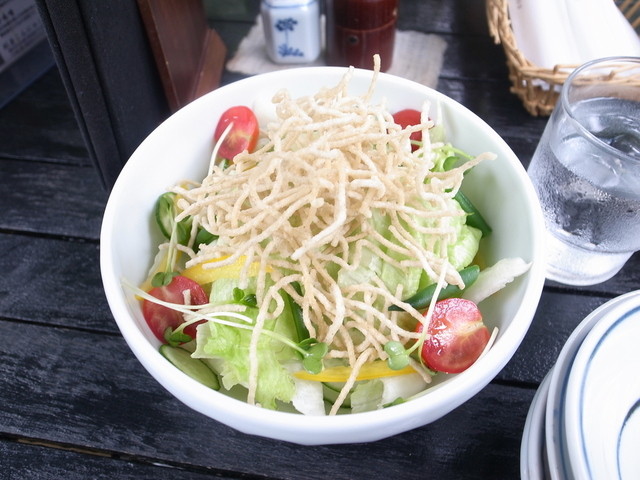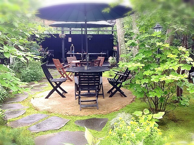 太陽が見え隠れする空模様、そこで、今回は愛犬と一緒にテラス席をお願いします。パラソルの丸テーブル席は満席で、奥の横長のテーブル席に案内されます。メニューを拝見、今回は単品料理とシン...