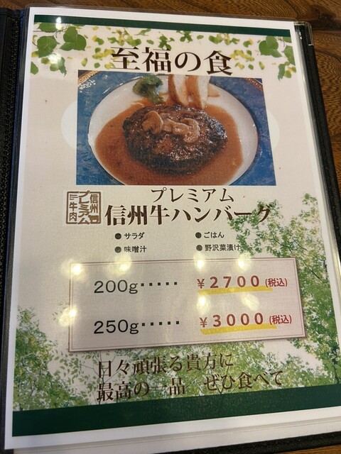 大きさ230gで肉汁溢れるBiGなハンバーグはホントにウンまい今回2度目になります。前回もアウトレットの訪問の際に寄らせてもらい前回のあまりにもおいしかった記憶に沿っての来店です。これが、信州牛のハン...