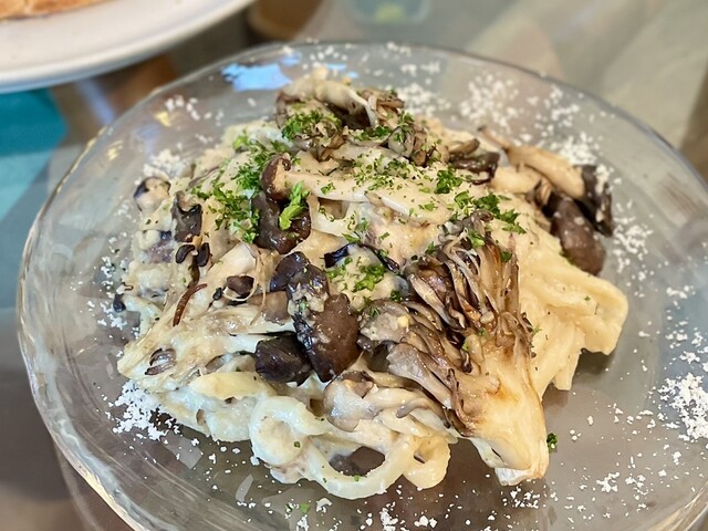 ピザと同じ生地を使ったオリジナルパスタ。パスタというより手打ちうどんのような太麺でもっちり食感。旬のきのこがたっぷりで濃厚きのこベースの、クリームソースが麺によく絡まってます。粉チーズが良いアクセント。