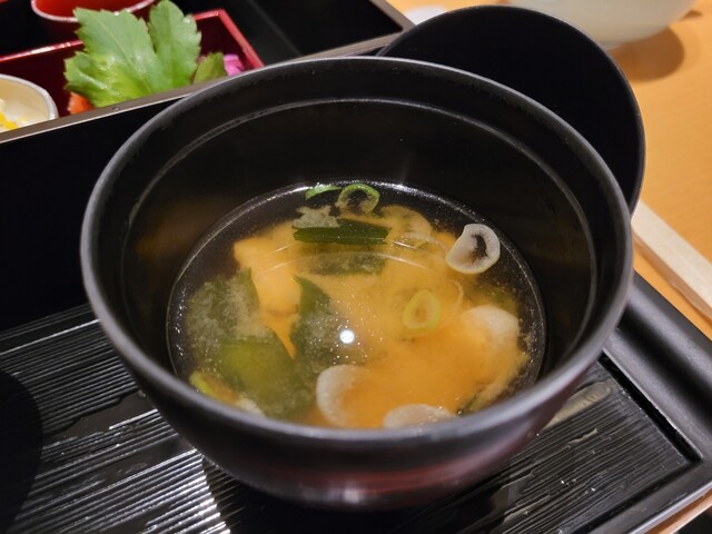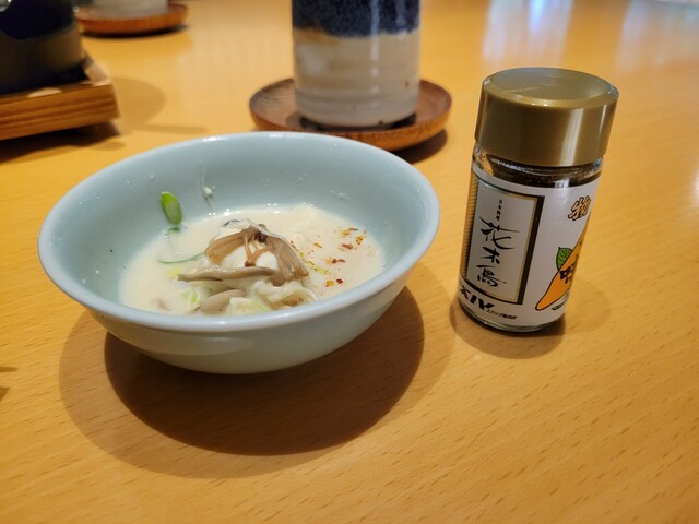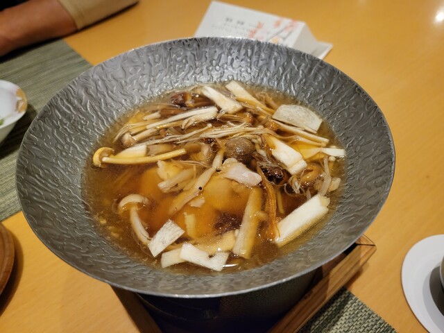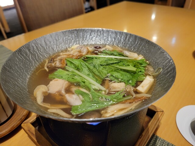 信州味噌仕立て、信州産茸、鶏団子、豆腐、葱、等々