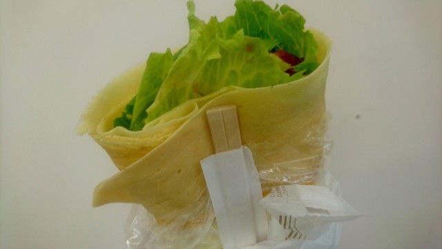 同僚はロースハムクリームチーズ、マッシュ風ポテトクレープ、私は同僚が見たいというので唐揚げマッシュ風ポテトクレープに。共にレタスとポテトサラダがたっぷり、一方はそこに大量のロースハムとクリームチーズ、もう一方は唐揚げ4個。お腹いっぱいになりました。