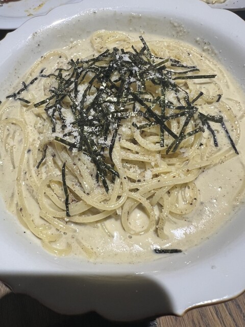 煮干しバターのクリームパスタで、クリームの味わいとガッツリ香る煮干しとバターの味わいが非常に美味しく、余ったバゲットと一緒にソースまで食べ尽くしてしまいました(笑)