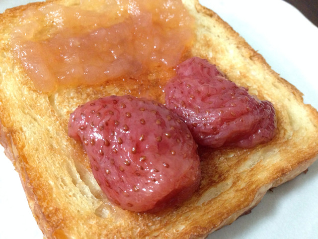 様々な味がありますが、万人受けするブルーベリージャムと個人的に大好きな白桃ジャムであります。