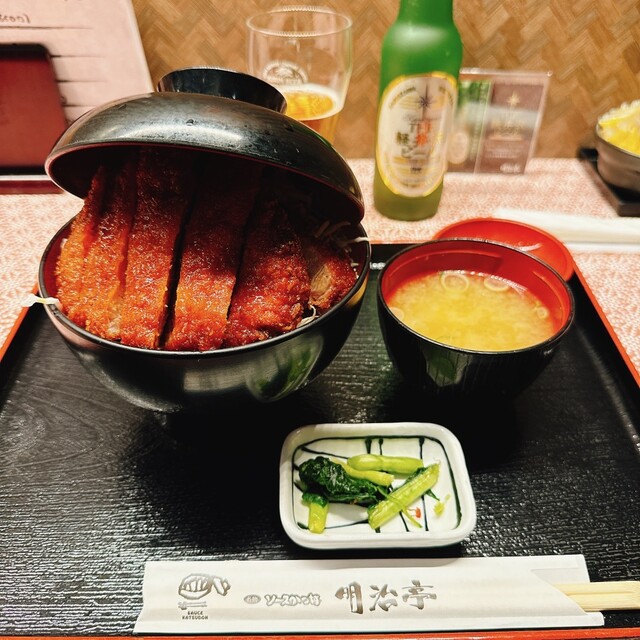 地元の信州駒ヶ根ではお客様が訪れるときや、お祝い事には「ごちそうを」と駒ヶ根の特色のあるお料理を食べますが、その中でも一番人気のあるのが「ソースかつ丼」です。 大人から子供までが喜んで食事のできる一品です。今やソースかつ丼の店「明治亭」と皆さんが答えますが、元々は会席料理や宴会料理を中心とする他に生け簀を店内に置活魚も扱う日本料理店で、職人がソースかつ丼にも材料の仕入から下準備、仕込など職人の厳し...い目で調理されるかつ丼は、地元産信州産の良質なロース肉が柔らかく深い味わいと、地元産自家製ソースの独特な味わいがたまらない、一度食べたら忘れない味です。