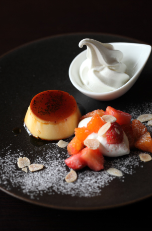 クラシックプリン フルーツマリネとソフトクリーム (by お店)