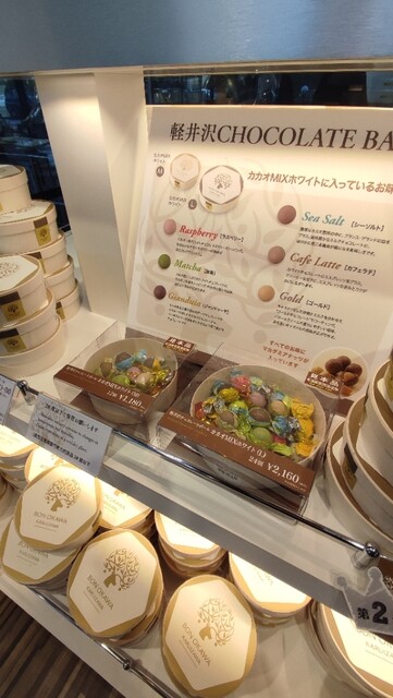 チョコレートとラスクの専門店。フルーツの味が引き立つよう、あえてミルク感を抑えたホワイトチョコをベースに使用するなどチョコレートへのこだわりは本物。中でも、マカデミアナッツを、長野県産のりんごを使用したホワイトチョコでコーティングしたチョコレートボールりんご味は、甘さとりんごの酸味のハーモニーをお楽しみいただける人気の商品です。軽井沢で製造したこだわりのお菓子を、特別な方へのお土産にいかがですか。