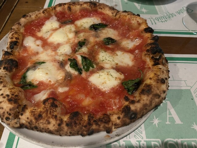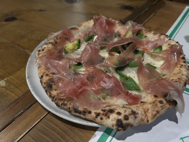 薪窯で焼かれたピッツァは、外はパリッと、中はもっちり。特に生地の甘みが際立ち、小麦の風味が豊かでした。春野菜のシャキシャキ感が心地よく、バジルの香りがフレッシュで印象的。生ハムの塩気と黒コショウがアクセントになり、全体のバランスが良かったです。