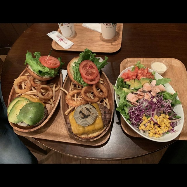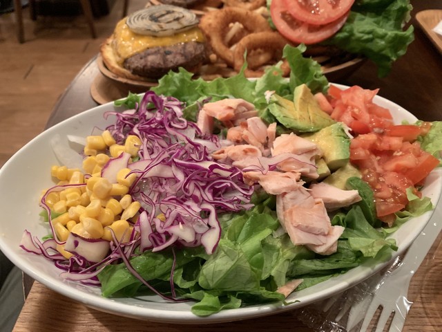 注文したのは、チーズバーガーとアボガドチーズバーガー、それに、コブサラダを頼んだところ、サラダのドレッシングを選べと言われて?(はてな)という感じに。
