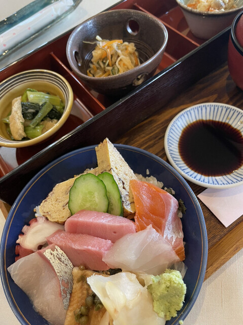野菜づくしランチセット、デザートをつけて1780円。満腹です。自家製漬物も美味しく、素材の味が活かされています。友人は唐揚げセット。サスサクで食べきれません。ちらし寿司セットはタコが美味しそう。魚の煮...