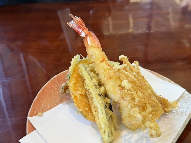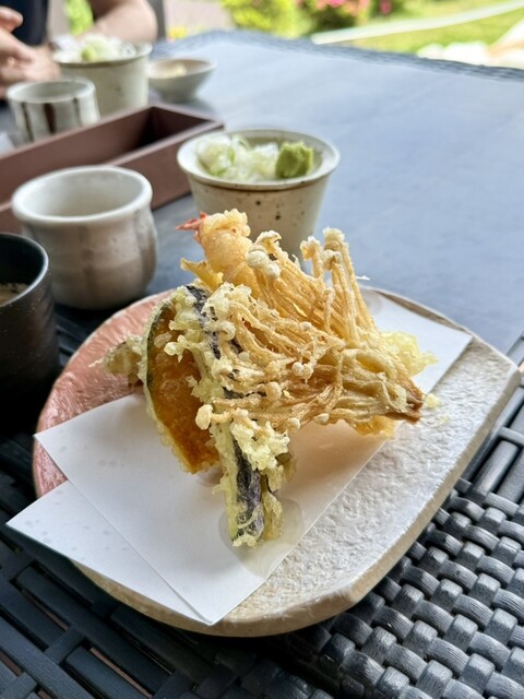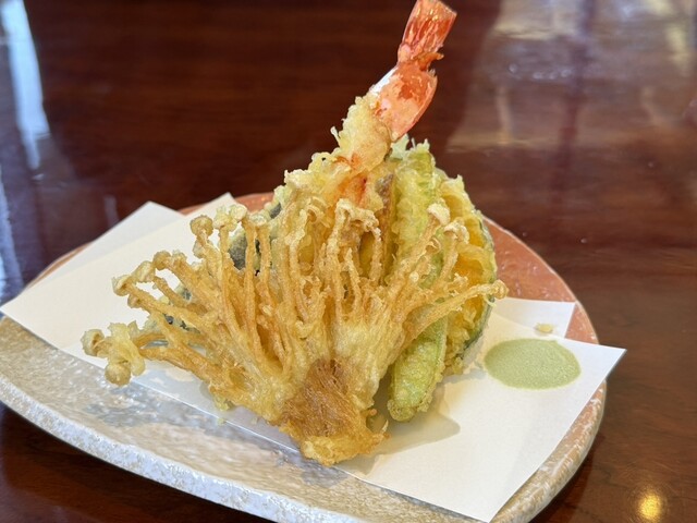 抹茶塩が脇に添えられてあり、それを少しつけながらいただく。 天ぷらは海老、カボチャ、えのき、茄子、舞茸など。