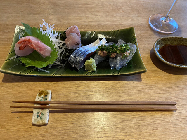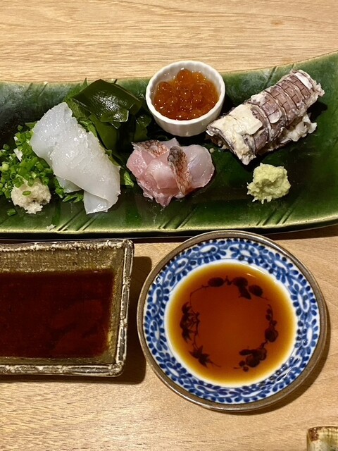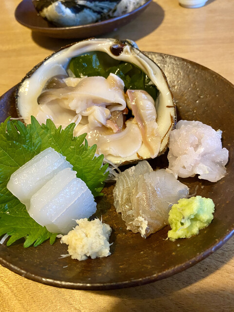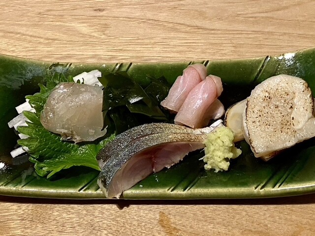 3、お造り(ヒラメ縁側、しめ鯖、クロムツ、平貝)