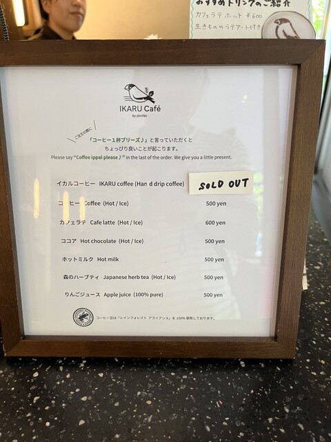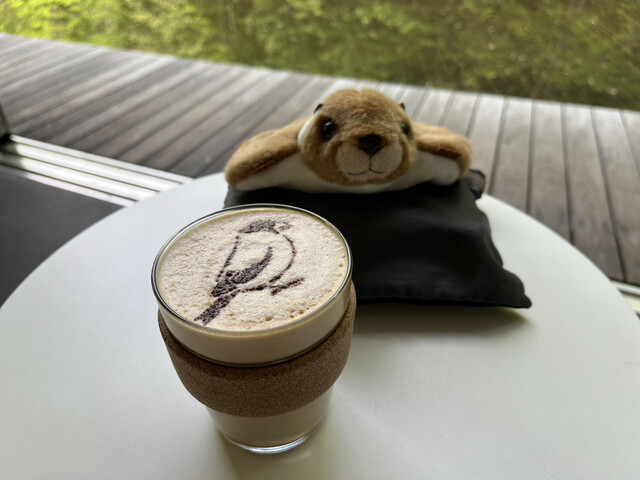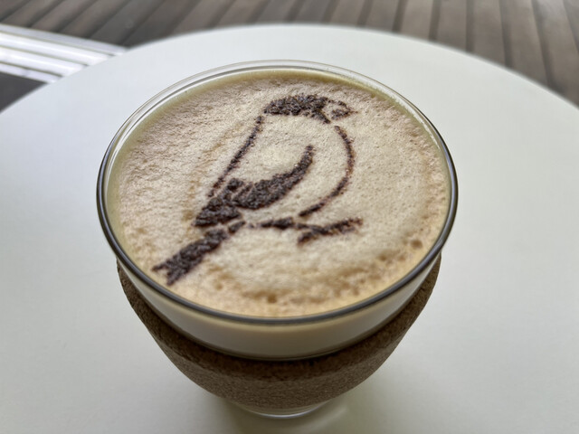 ・カフェラテには野鳥の絵柄。鳴き声がイカルコキーと聞こえることからイカルという名がついたとも言われる。注文時にコーヒー1杯プリーズ♪と伝えるのを忘れずに。