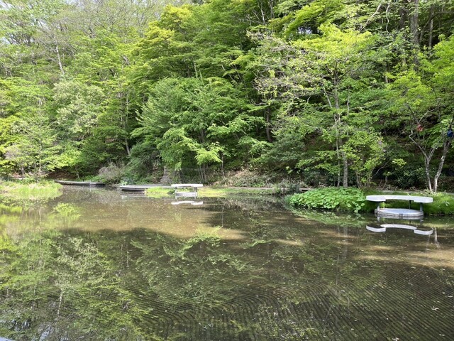 ・森林に囲まれたケラ池には野鳥やトンボなど様々な生き物が訪れる。この水辺を望むソファで、カフェラテや、ハーブティー、ハンドドリップコーヒーなどを楽しめる。