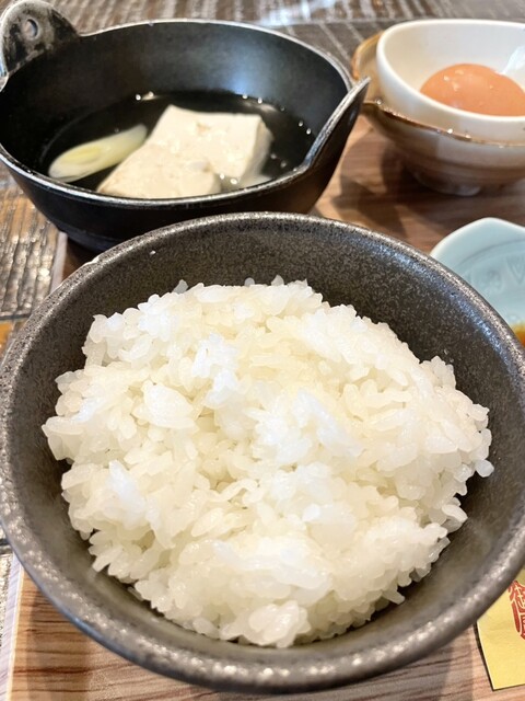ごはん、生たまご、湯豆腐、コロッケ、小鉢、豚汁、お漬物
