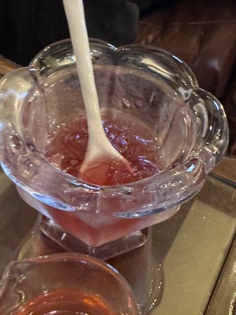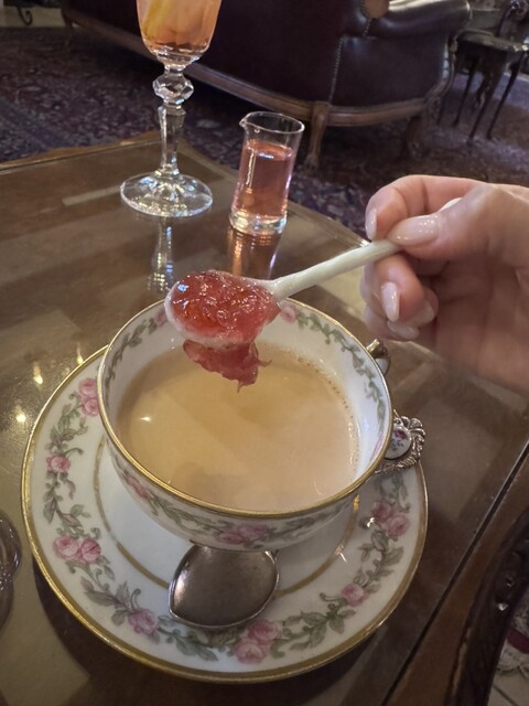 テラスに着席、テーブルセッティングも素敵すぎました。まずはローズティー。華やかで癒される香りでした。ローズジャムを入れると甘みが加わり一層華やぎました...