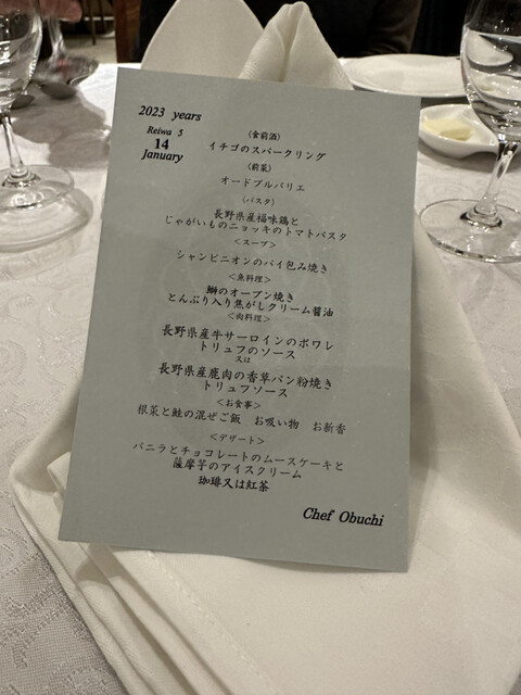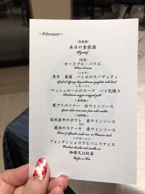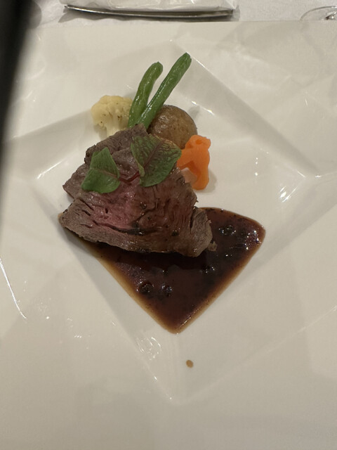 食前酒にオードブル、パスタにスープにお魚料理、お肉料理。お肉は牛肉と鹿肉か選べました。