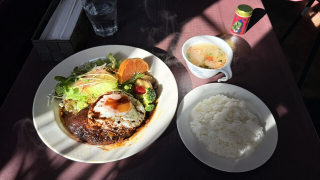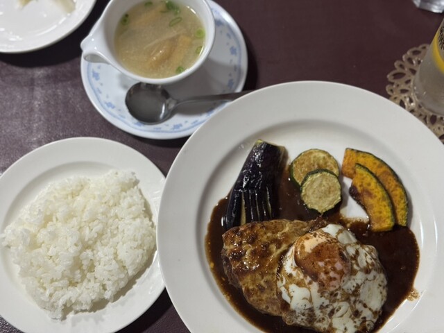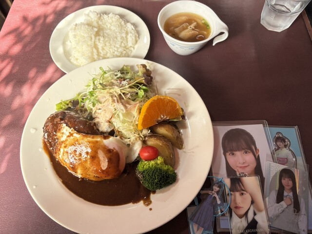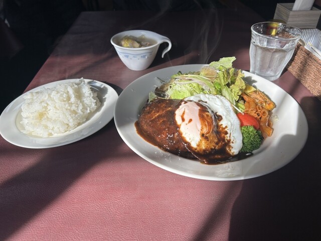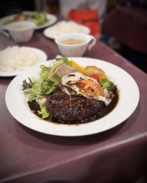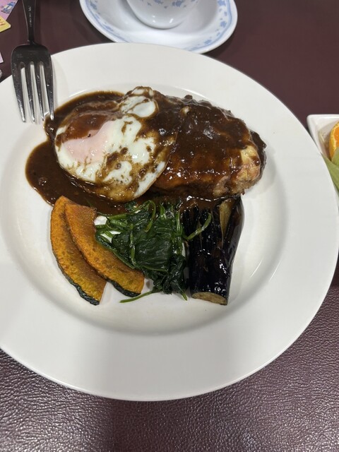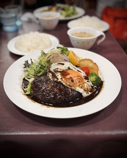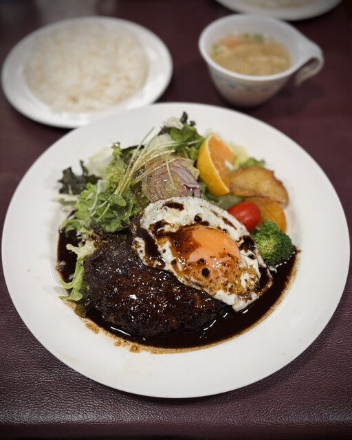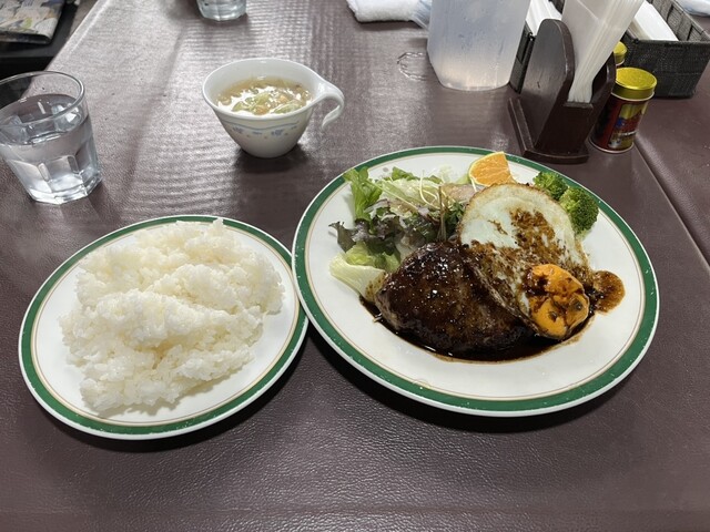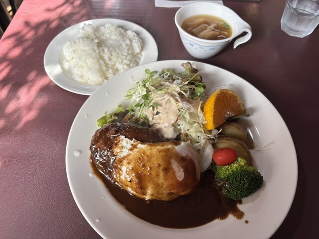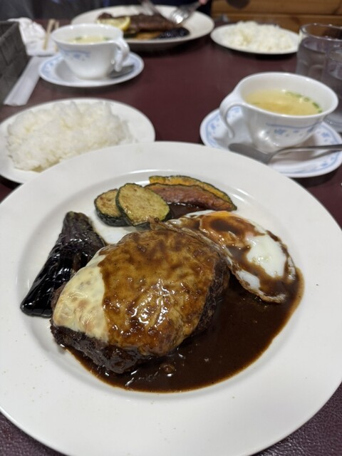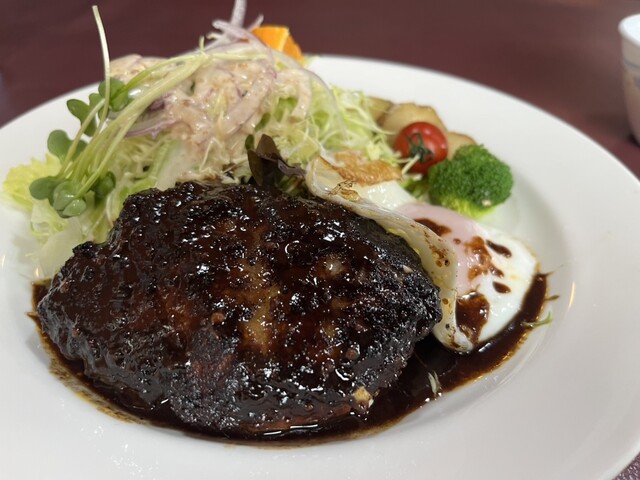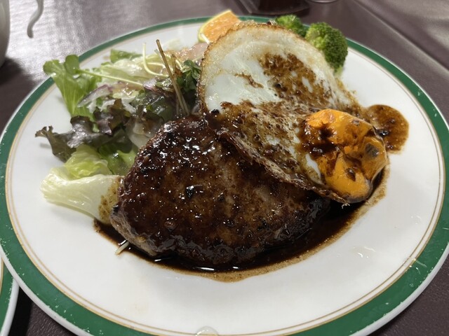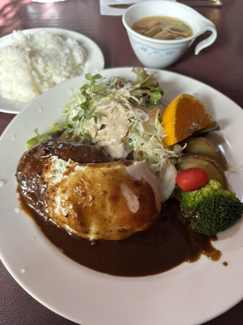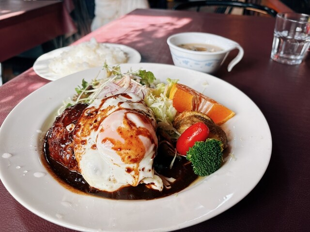 2025年に百名店選出!!軽井沢が誇る老舗洋食店!!人気のデミソースと目玉焼き添えのハンバーグ(サラダ、ライス、スープ付き)1,680円が絶品!!