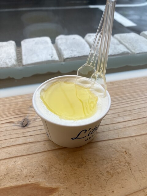 ミルクジェラートに高級なアウボカーサオリーブオイルがたっぷりかかっています。