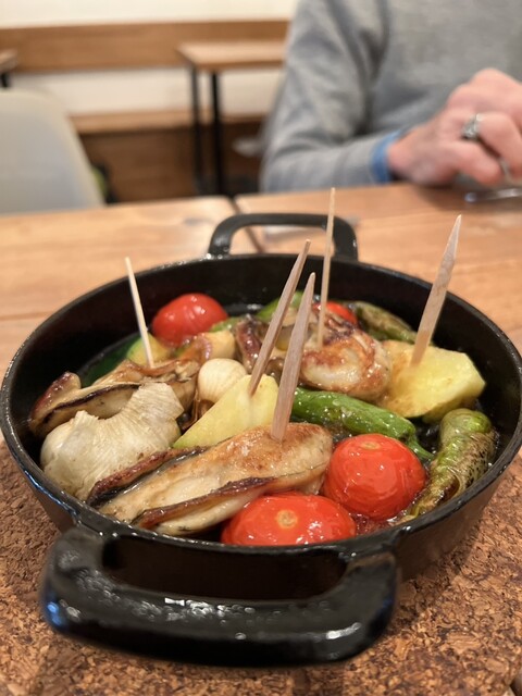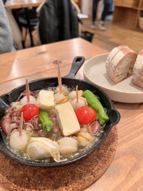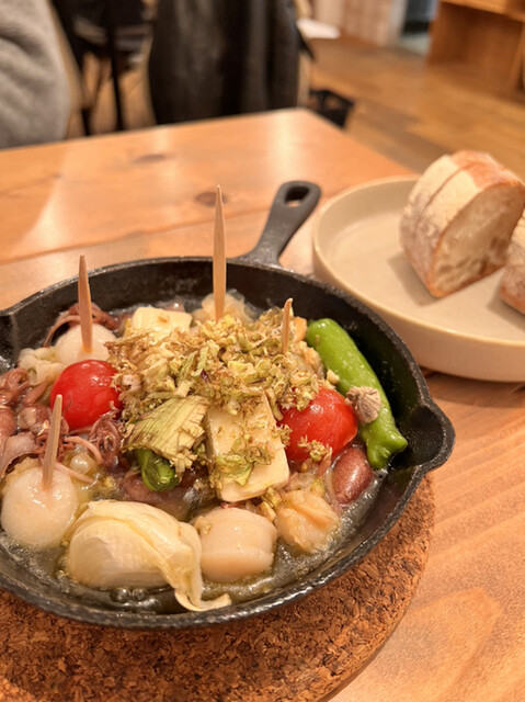 その後はシーフードとモッツァレラチーズ、ミニトマトなど具沢山のアヒージョ。アッツアツで今が旬のホタルイカ、小ぶりのホタテがふんだんに入っていて楽しい一品。目の前で生のふきのとうを刻んだ薬味を乗せてくれたがこれが絶妙に美味しかった。