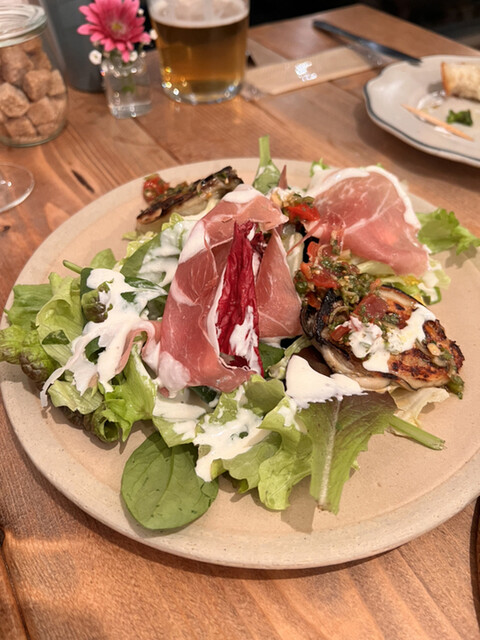 おまかせ前菜の生ハムと牡蠣のグリルが乗ったシーザーサラダ風は驚かされる一品だった。牡蠣が大きく新鮮。