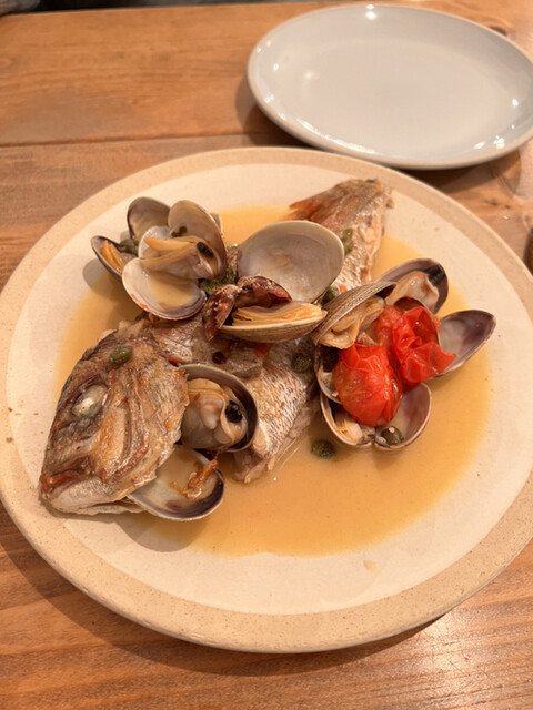 この日の鮮魚は金目鯛のアクアパッツァ。少し小ぶりの金目鯛だが、よくアサリの出汁が出ていて品のいい一品に仕上がっている。