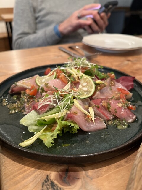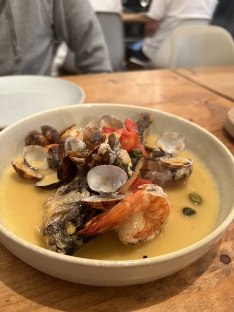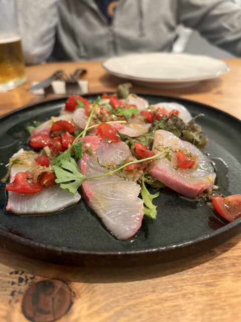 カンパチのカルパッチョは切り身の厚さに喜び、ヤナギダコといたや貝のアヒージョはいたや貝の新鮮で独特の歯応えや味わいに驚き、タカベのアクアパッツァはタカベの存在感に舌鼓を打った。唸るほど美味い。
