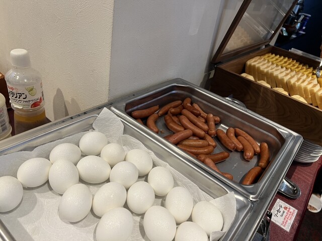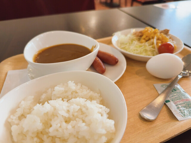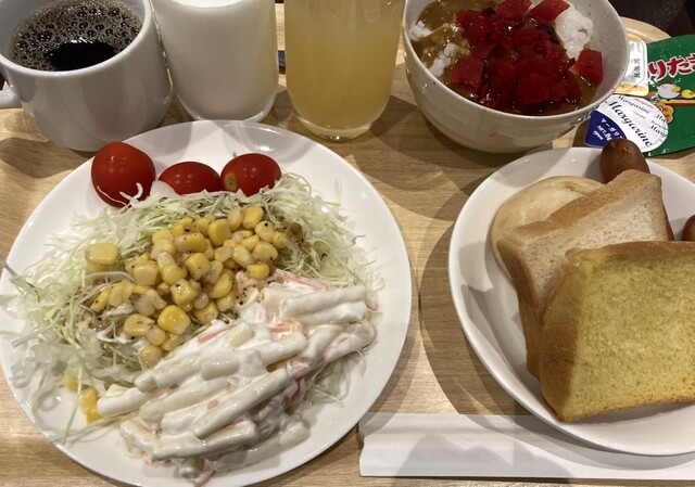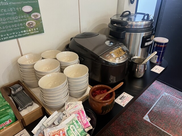 素泊まりか朝食付きかの選択肢はなくて、宿泊の人には全員モーニングがついています。こじんまりとしたスペースの軽食ってかんじ。ご飯やパン、カレー、サラダ、ソーセージ、ゆで卵がありました。あとは牛乳やコーヒ...