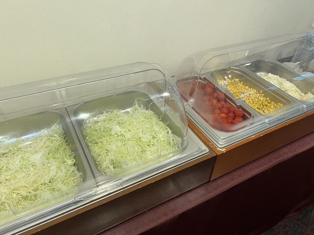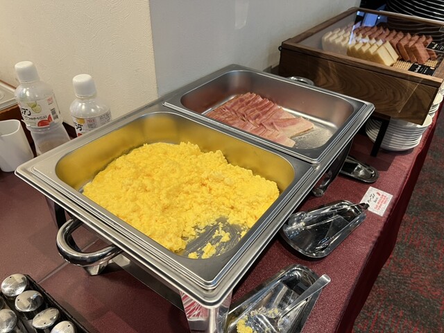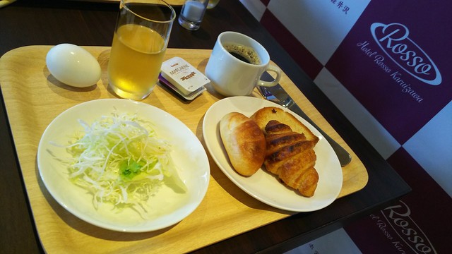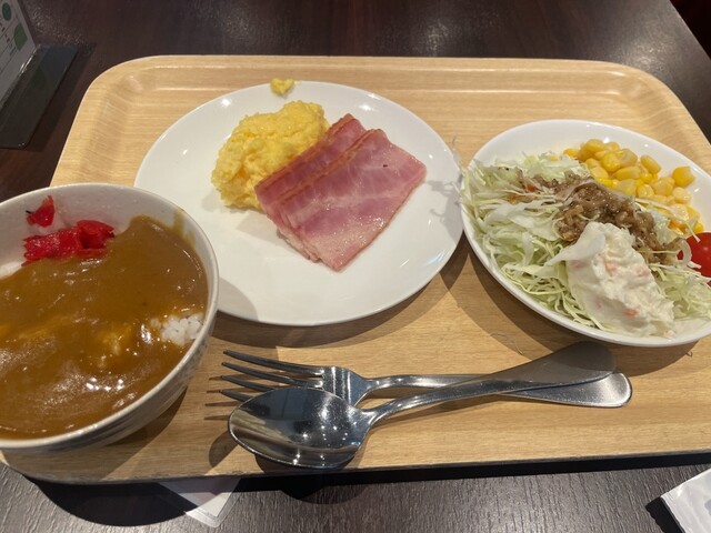 軽井沢のちょっとしたホテルです。朝ごはんのビュッフェは品数はそこまで多くありませんが、カレー、パン、ベーコン、たまご、サラダなのでビジネスホテルの朝ごはんという感じかと。