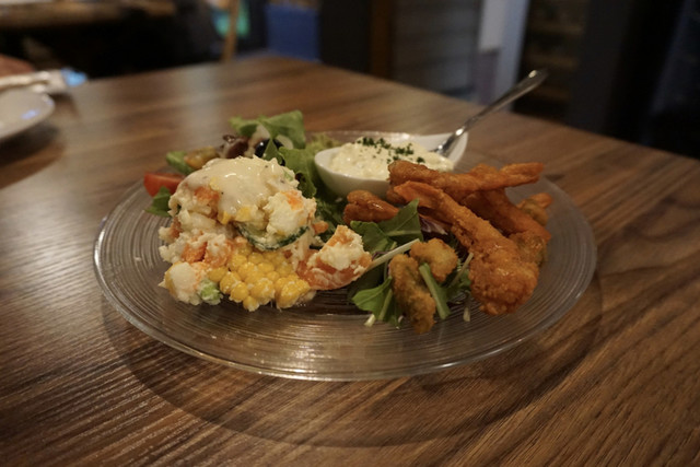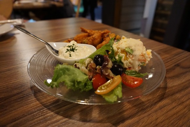 …自家製のタルタルソースにゆで卵の黄身、白身がゴロゴロ入っていて美味しい。小エビはカリッと軽い食感で揚がっており、エビも歯ごたえ良くかつ噛み切り易いです。