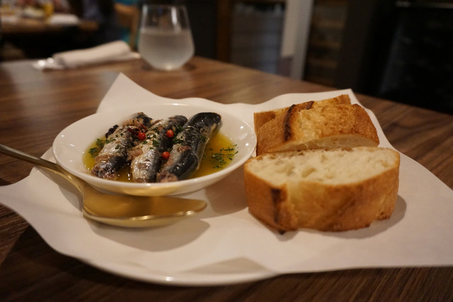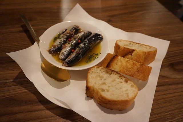 …イワシは骨まで柔らかく美味しいです。素材も良いのでしょう、臭みも全くなく、オリーブオイルを使った美味しい味付けによって旨味が引き出されています。バゲットは温かく、塩味のそこそこ効いた素朴な味。